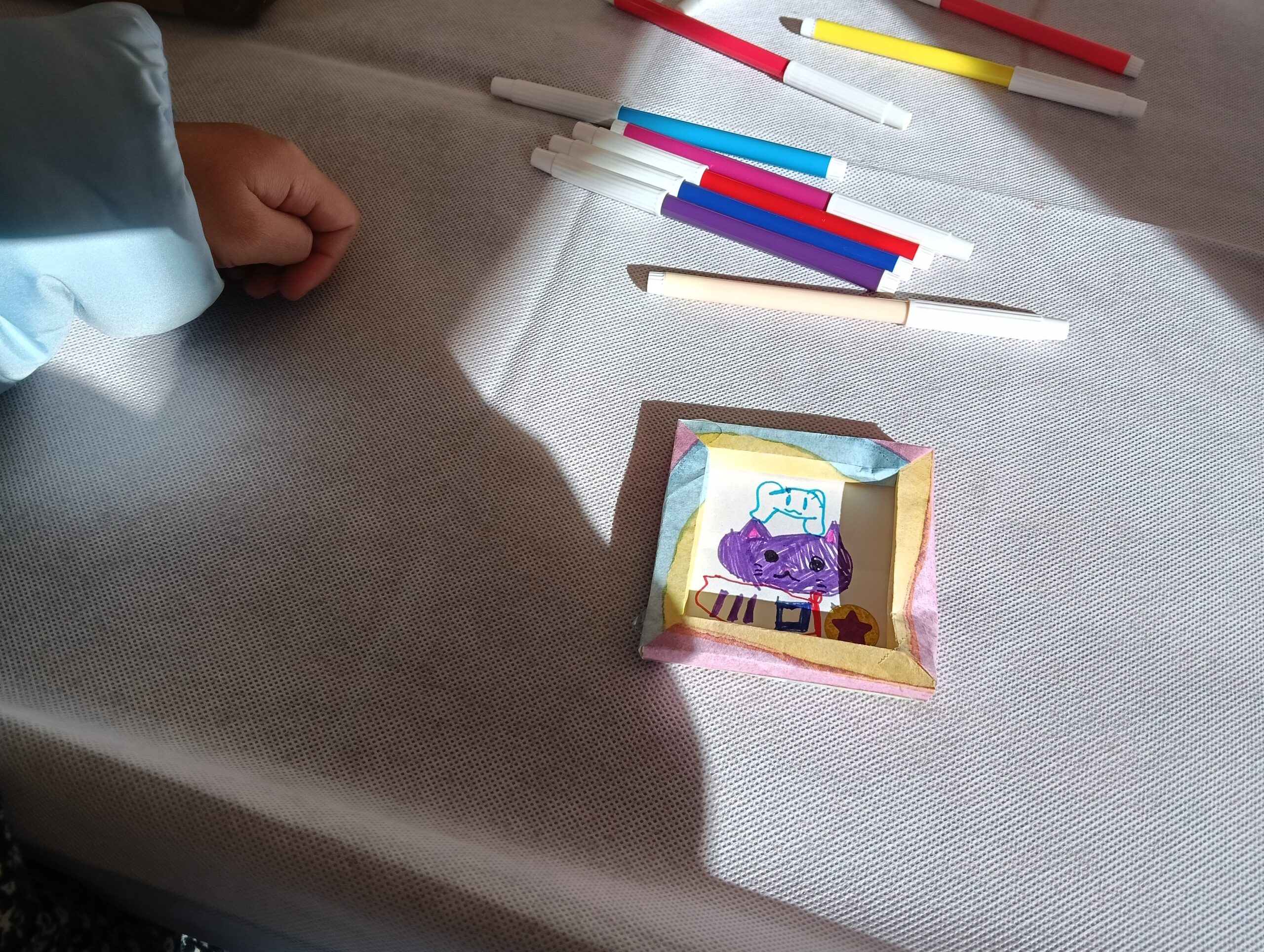 「額縁を作る」と言っても、実際我々が作っているアルミ製などの額縁の取り扱いは危険なので、折り紙を折って額縁を作り、その中の空間にペンで絵を描き、用意したシールの中で好きな柄を貼ってもらいました。