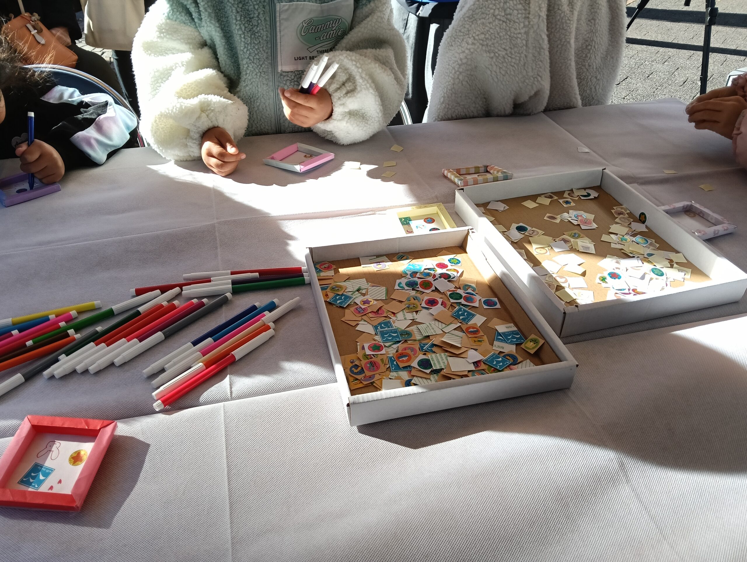 アルナは額縁メーカーなので、実際子供達に額縁を手作りしてもらい、自分達が描いた絵や好みのシールを手作りした額縁の中に貼ってもらい、持ち帰ってもらう企画を行いました。