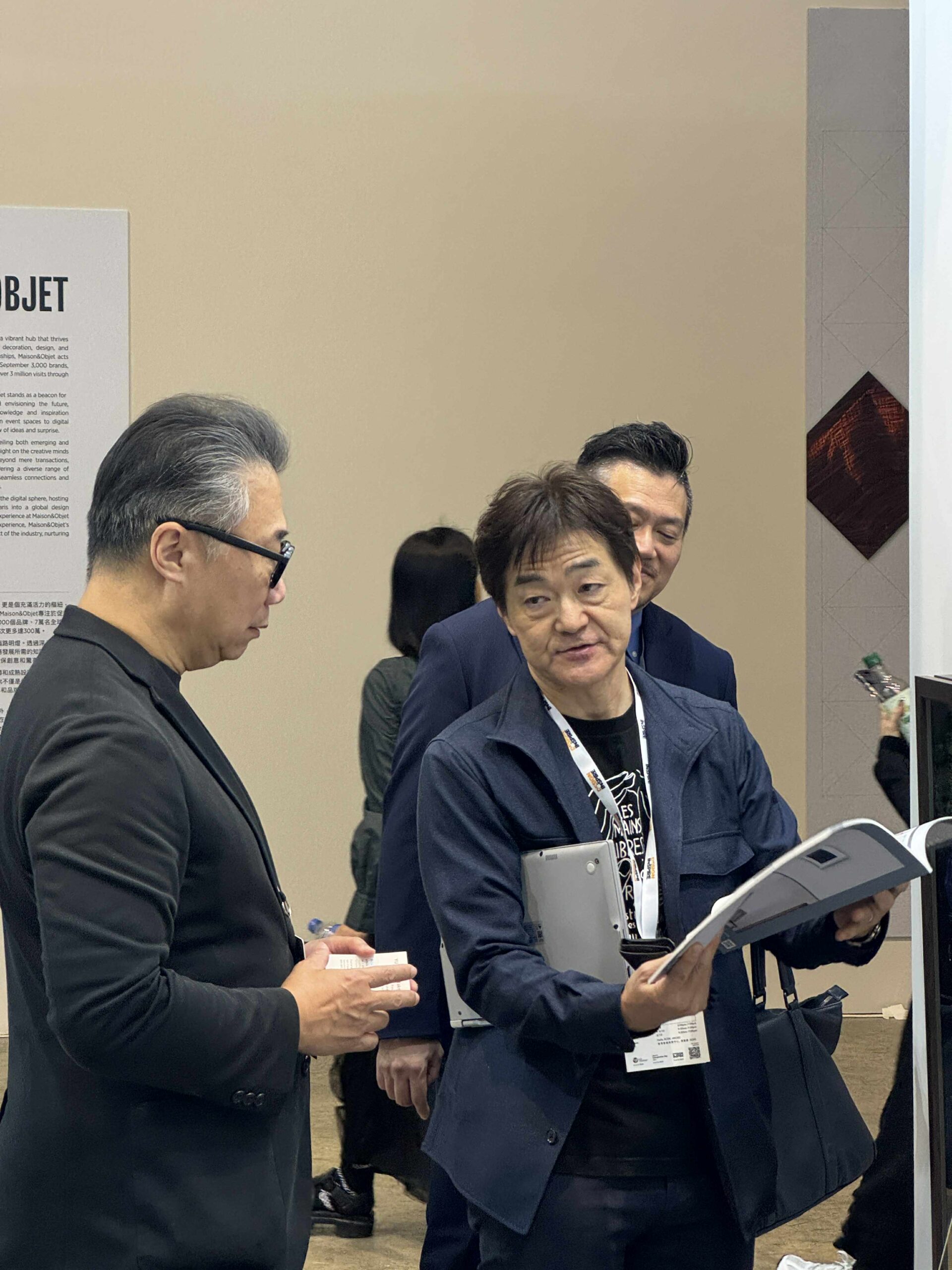 「香港の安藤忠雄」と言われている、香港デザインセンター会長のエリック・イムさんにも、弊社製品を紹介させてもらい、記念写真も撮らせていただきました。
