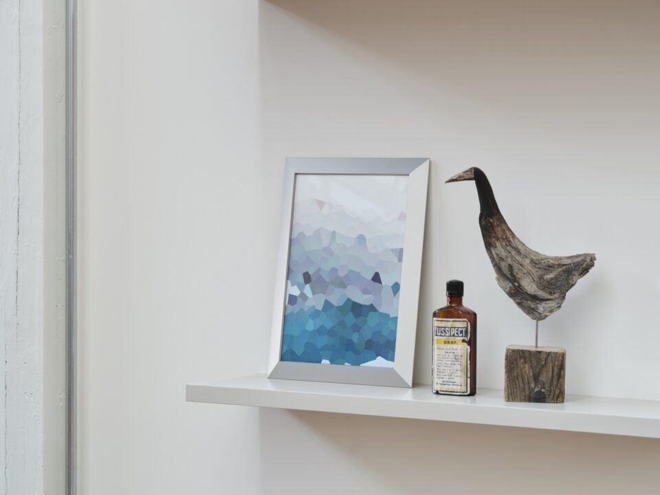コーナーで切り替わるアルミの光の反射が、シャープな陰影を生み、作品を美しく引き立てつつ、空間に凛とした緊張感を添えます。